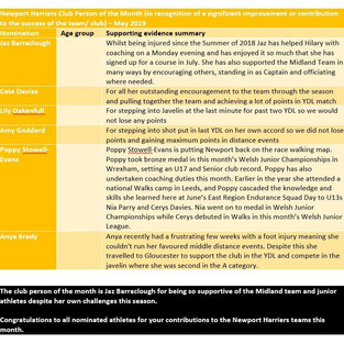 Newport Harriers, your club person of the month is Jaz Barraclough for her willingness to support the Midland League team and junior athletes, despite some challenges of her own this summer.