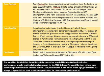 Newport Harriers, your athlete of the month for June with a fabulous new National Record is Ellie-Mae Wainwright. Congratulations to all nominated athletes again.